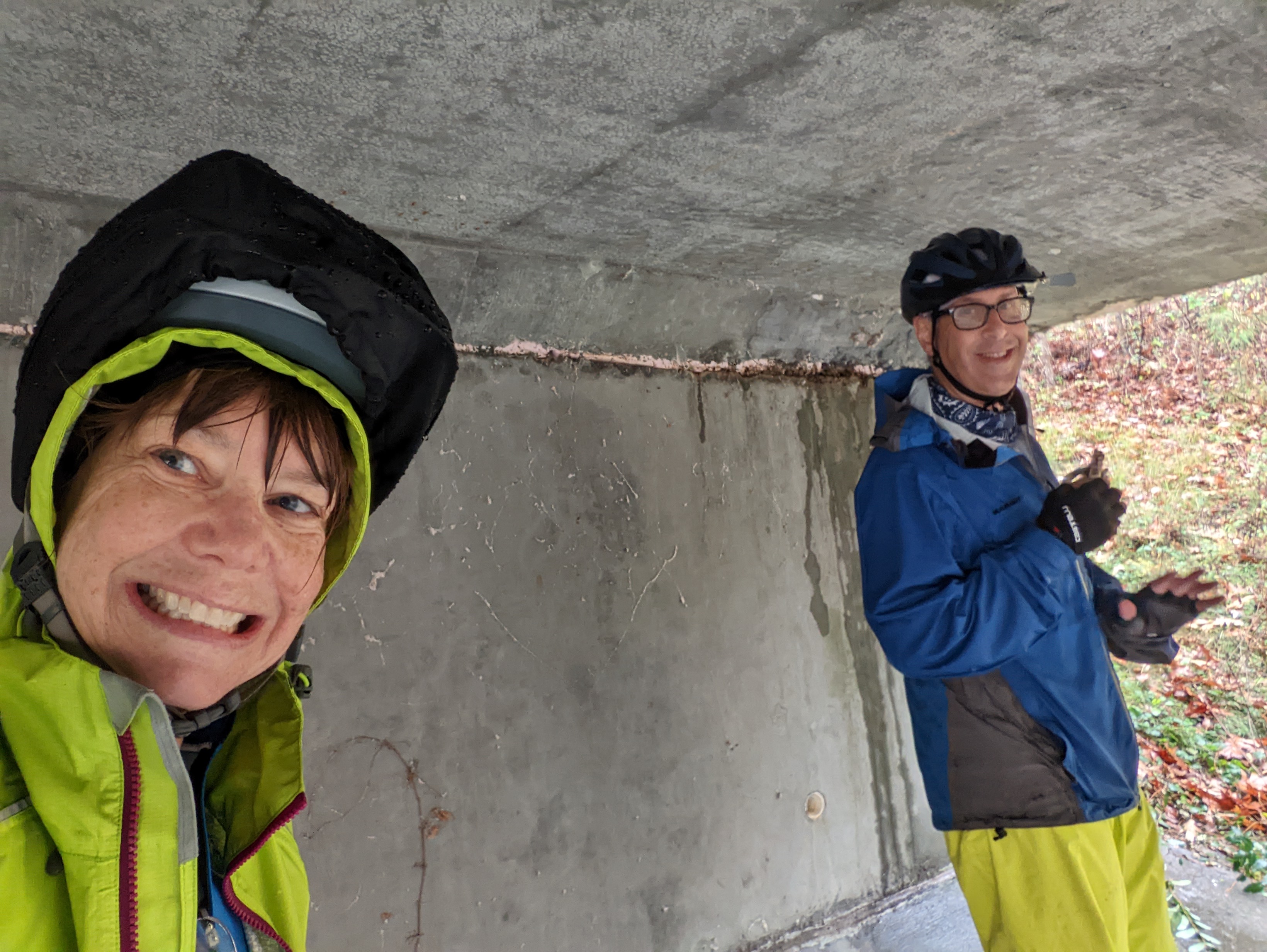 We hit the road in the rain. With no picnic stops or bathrooms for shelter we had our morning snack under an over pass, hey it works.